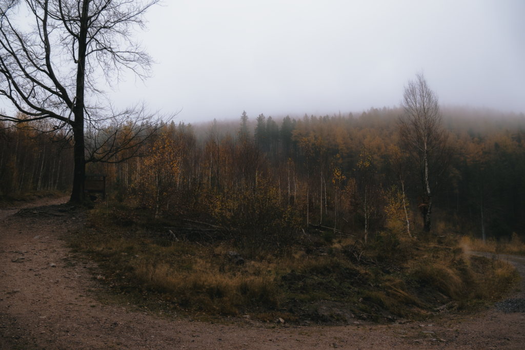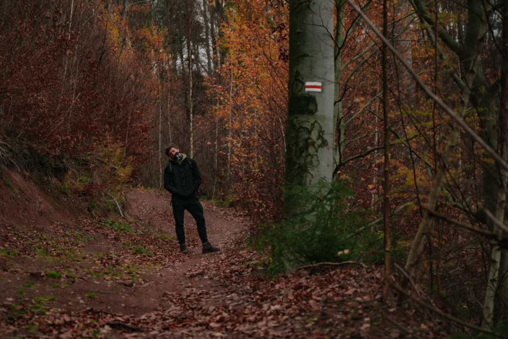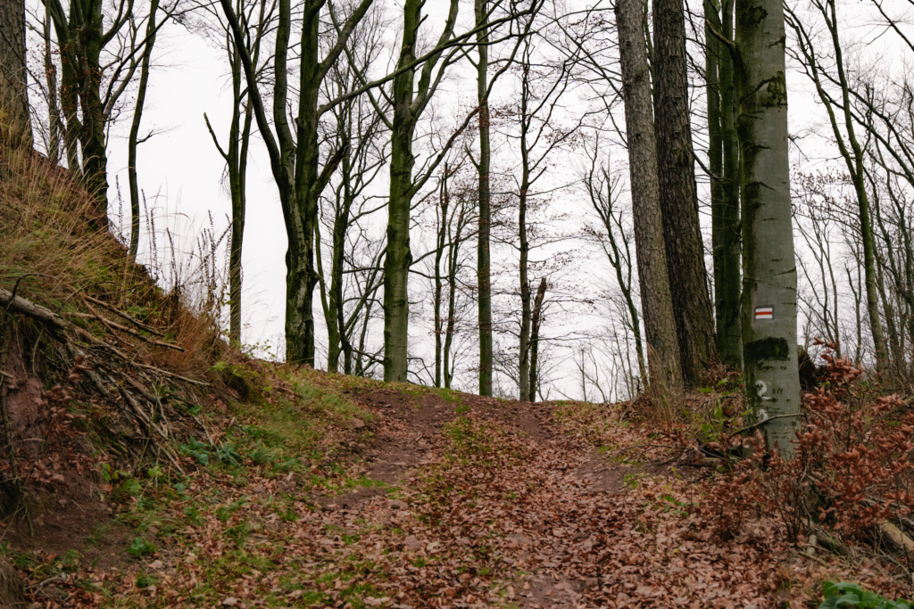 My zaczęliśmy naszą przygodę w miejscowości Grzmiąca, gdzie zaparkowaliśmy auto przy Gospodzie Sudeckiej – zamkniętej, więc tym razem obyło się bez opłaty za parking. Kilkadziesiąt metrów asfaltem, odbijamy na lewo i już łapiemy czerwony szlak. I od razu dostajemy w nogi jakąś „specjalną wersją triala”, bo pierwsze przewyższenia to naprawdę twardy orzech do zgryzienia.