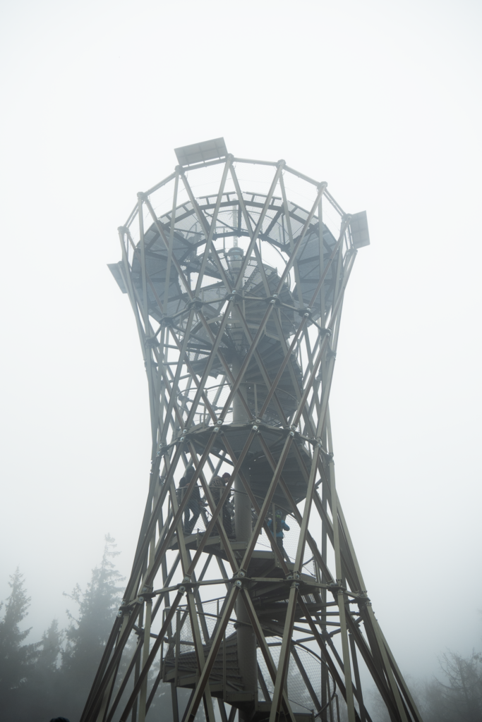 No dobra… teoretycznie jesteśmy. Bo praktycznie widzimy tylko mgłę tak gęstą, że mogłaby spokojnie otrzymać własny kod pocztowy. Panorama? Nie tym razem. Ale klimat – mistrzostwo. A żeby było jeszcze ciekawiej, na szczycie unosił się zapach kiełbasek smażonych przez grupę harcerzy, więc mgła mgłą, ale atmosfera była absolutnie topowa.