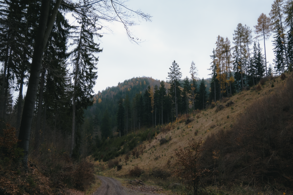 Po kilku kilometrach teren na chwilę się wypłaszcza, co daje złudne poczucie bezpieczeństwa… żeby po chwili znów zaserwować konkretny rollercoaster. W pewnym momencie przewyższenie dobijało aż do 37%, więc człowiek trochę czuł się jak w fabrycznym teście hamulców. Ale widoki leśne piękne, powietrze świeże, nogi działają – idziemy dalej.